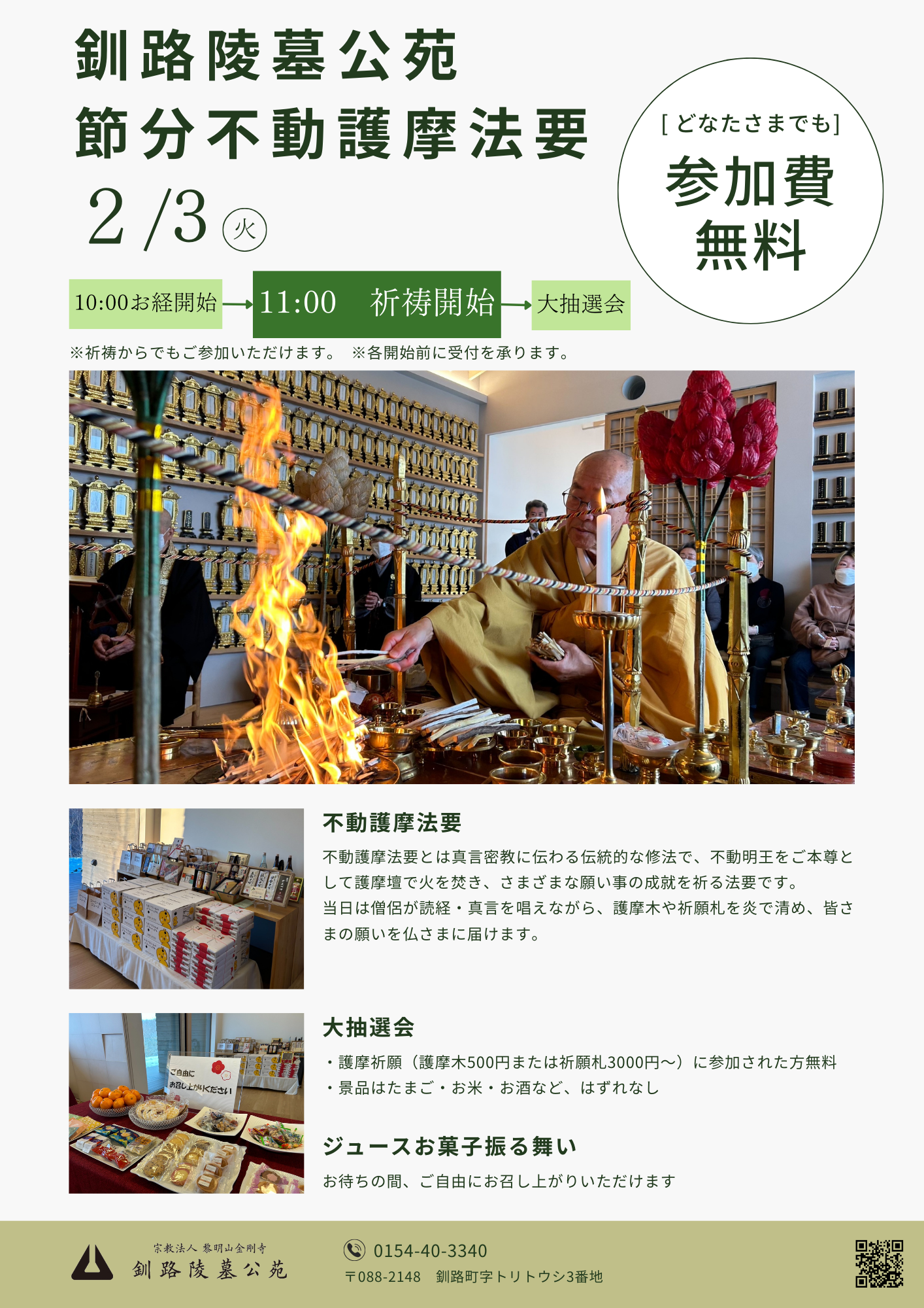 TOP 公苑からのお知らせ 公苑からのお知らせ PICK UP ピックアップ 2026年01月18日 お知らせ 【ご案内】令和8年2月3日 節分不動護摩法要のお知らせ 令和8年 節分不動護摩法要のお知らせ 釧路陵墓公苑では、毎年恒例の「節分不動護摩法要」を今年も厳修いたします。 ゆらめく炎とともに、ご家族の幸せや世界の平和を祈る特別なひとときを過ごしませんか… 記事を読む 2025年11月28日 お知らせ 行事レポート 不動護摩法要を執り行いました 本日、毎月28日に執り行っている護摩法要を執り行いました。 皆さまよりお預かりした護摩木の祈願内容とお名前を一つひとつ読み上げ、心を込めてご祈念いたしました。 静かな読経の響きとともに、ご先祖… 記事を読む 最近の記事 すべて お知らせ その他 メディア掲載 行事レポート 2023年10月19日 特別霊区 2023年10月12日 規格墓所