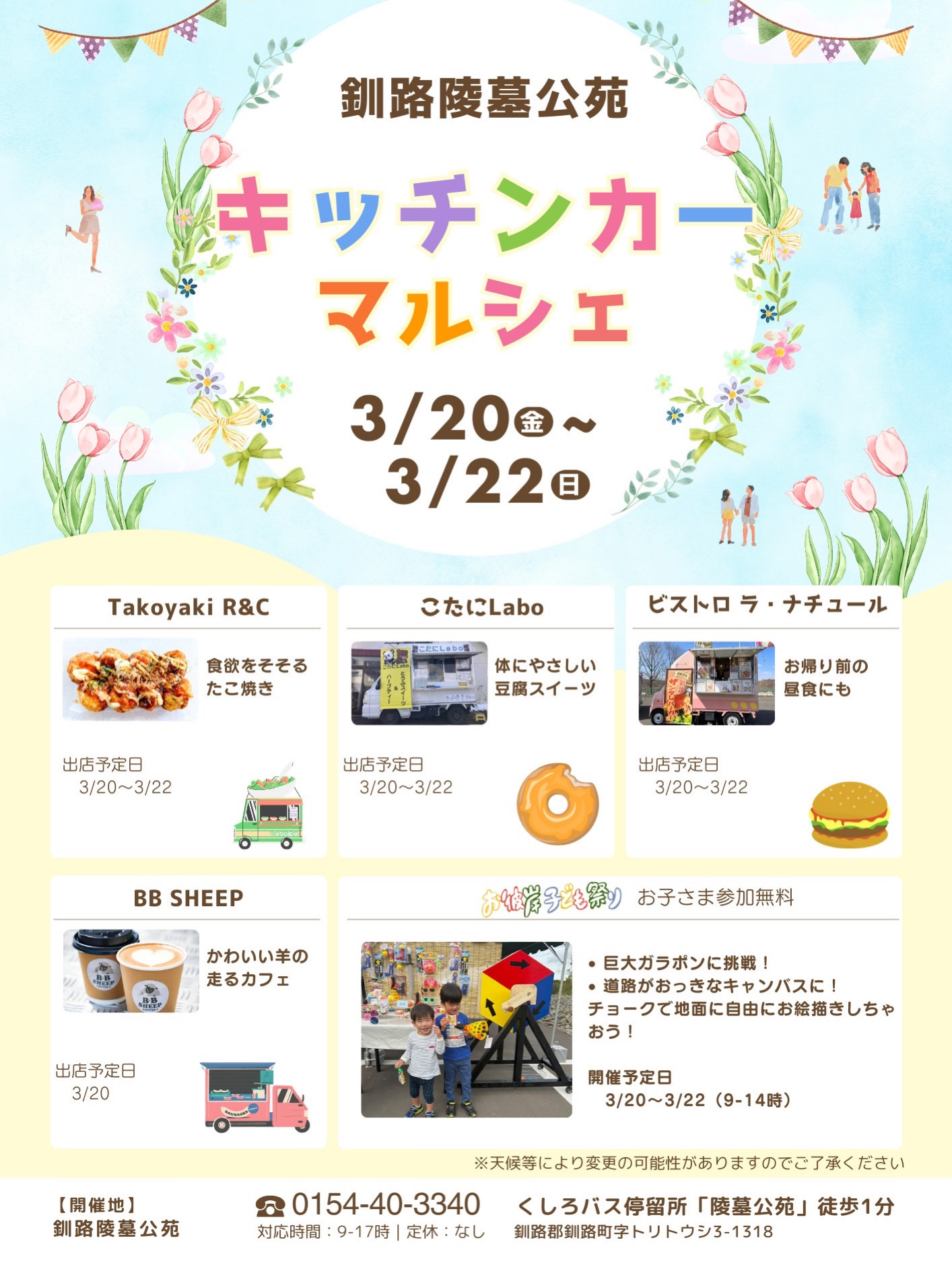 TOP 公苑からのお知らせ 公苑からのお知らせ 2026年3月の記事 すべて お知らせ その他 メディア掲載 行事レポート 2026年03月18日 【イベント告知】3/20(金)〜3/22(日) キッチンカーマルシェ&お彼岸子ども祭り開催! お知らせ
